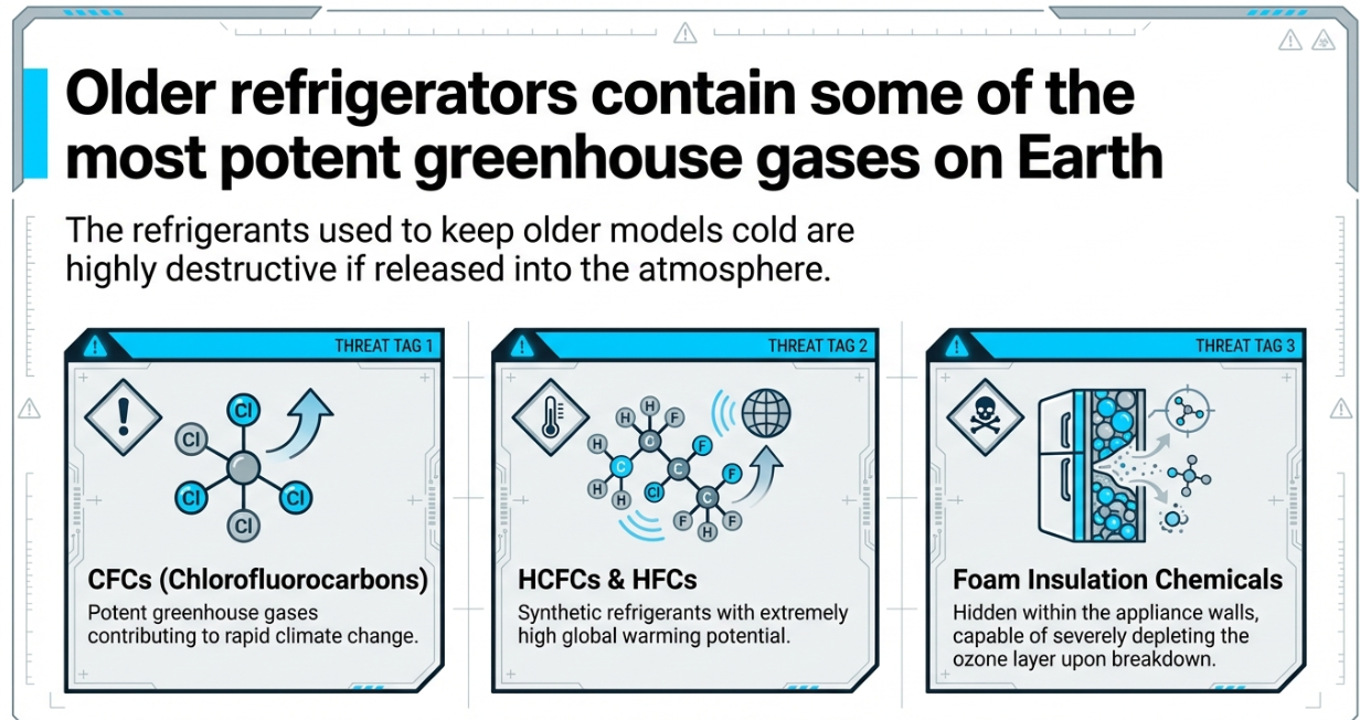 The refrigerants used in older models are often chlorofluorocarbons (CFCs), hydrochlorofluorocarbons (HCFCs), or hydrofluorocarbons (HFCs), which are potent greenhouse gases that can contribute to climate change. In addition, the foam insulation in older models may also contain chemicals that deplete the ozone layer. Therefore, it’s crucial to de-gas and dispose of these appliances safely.