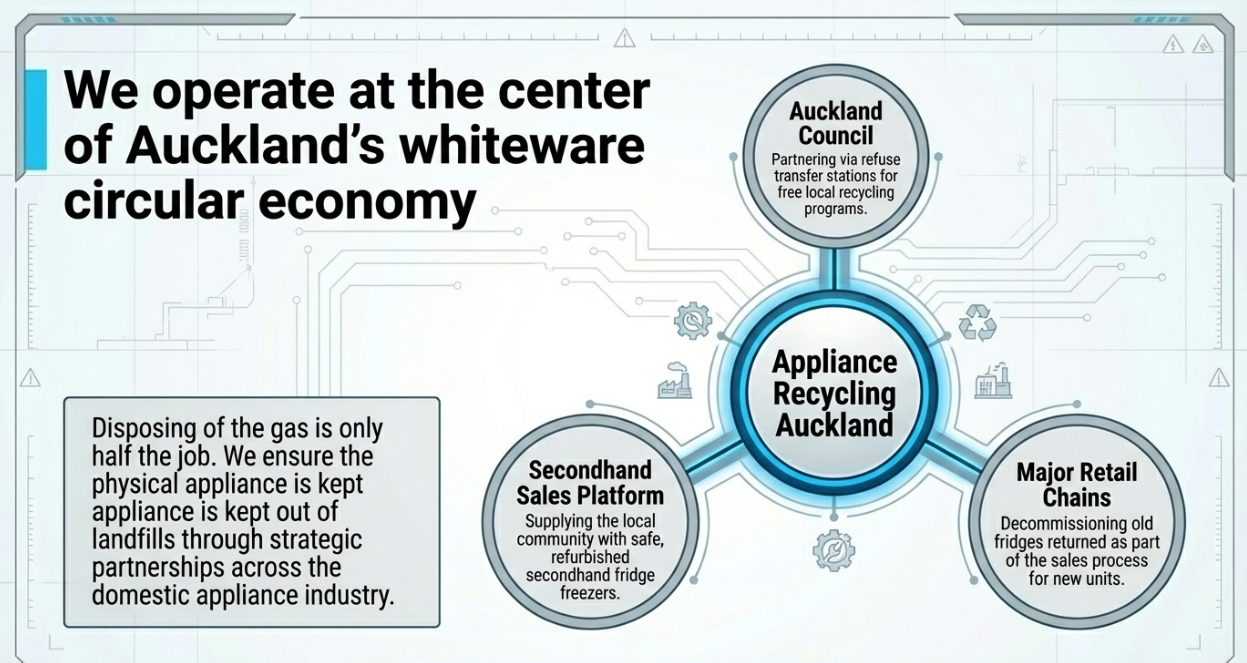 The first step in disposing of an old refrigerator or freezer is to find a qualified and licensed technician like us here at Appliance Recycling who can properly de-gas with the use of portable refrigerant recovery machines and equipment. Attempting to de-gas an old unit yourself can be dangerous, is not recommended and is now illegal in NZ.